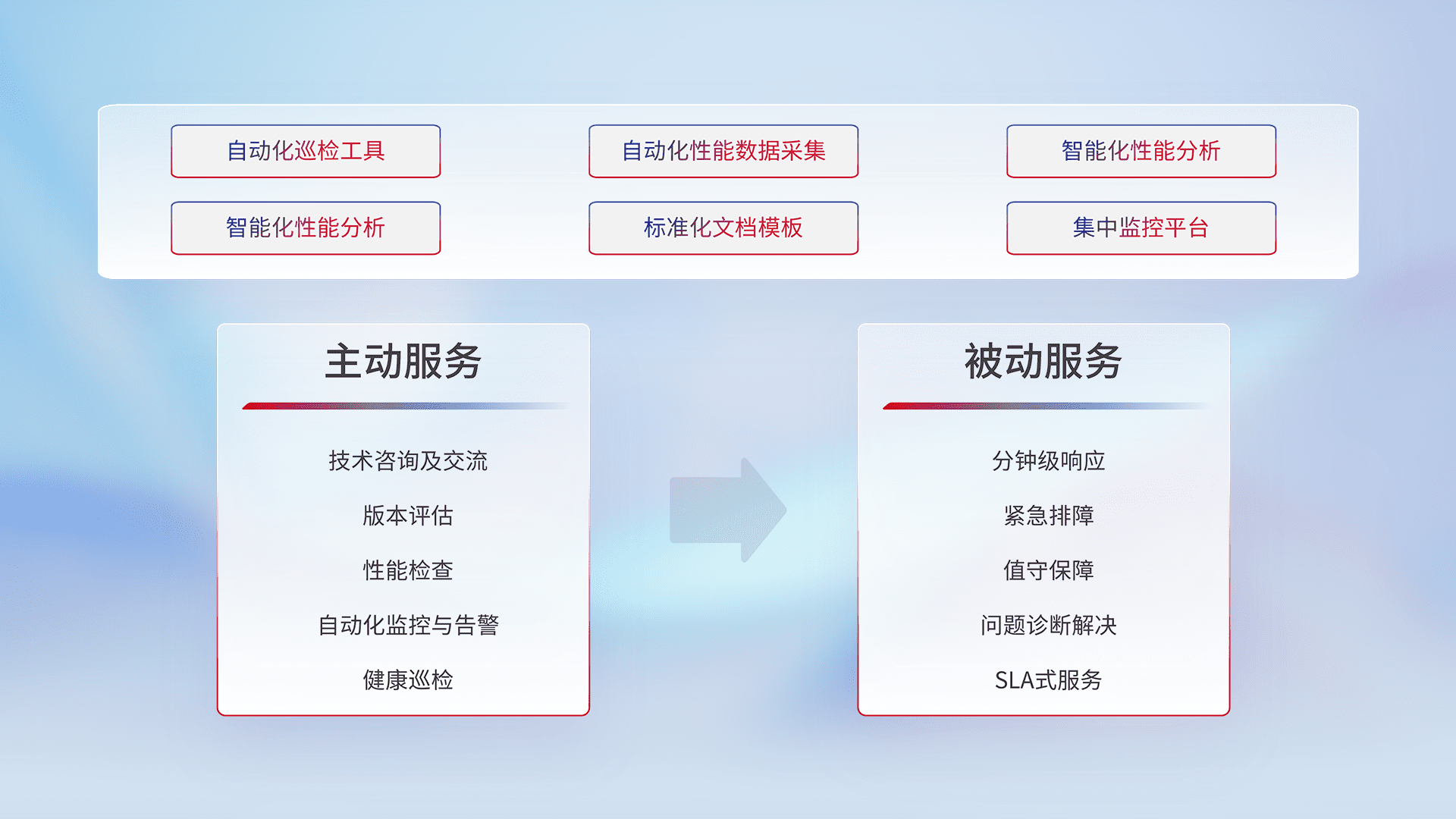 智能化工具和标准化文档,,保障服务质量,,提供主动服务(包含技术咨询、、、版本评估、、、性能检查、、、自动化监控与告警、、、、健康巡检)和被动服务包含(分钟级响应、、、紧急排障、、、值守保障、、、、问题诊断解决、、、、SLA服务)。。。