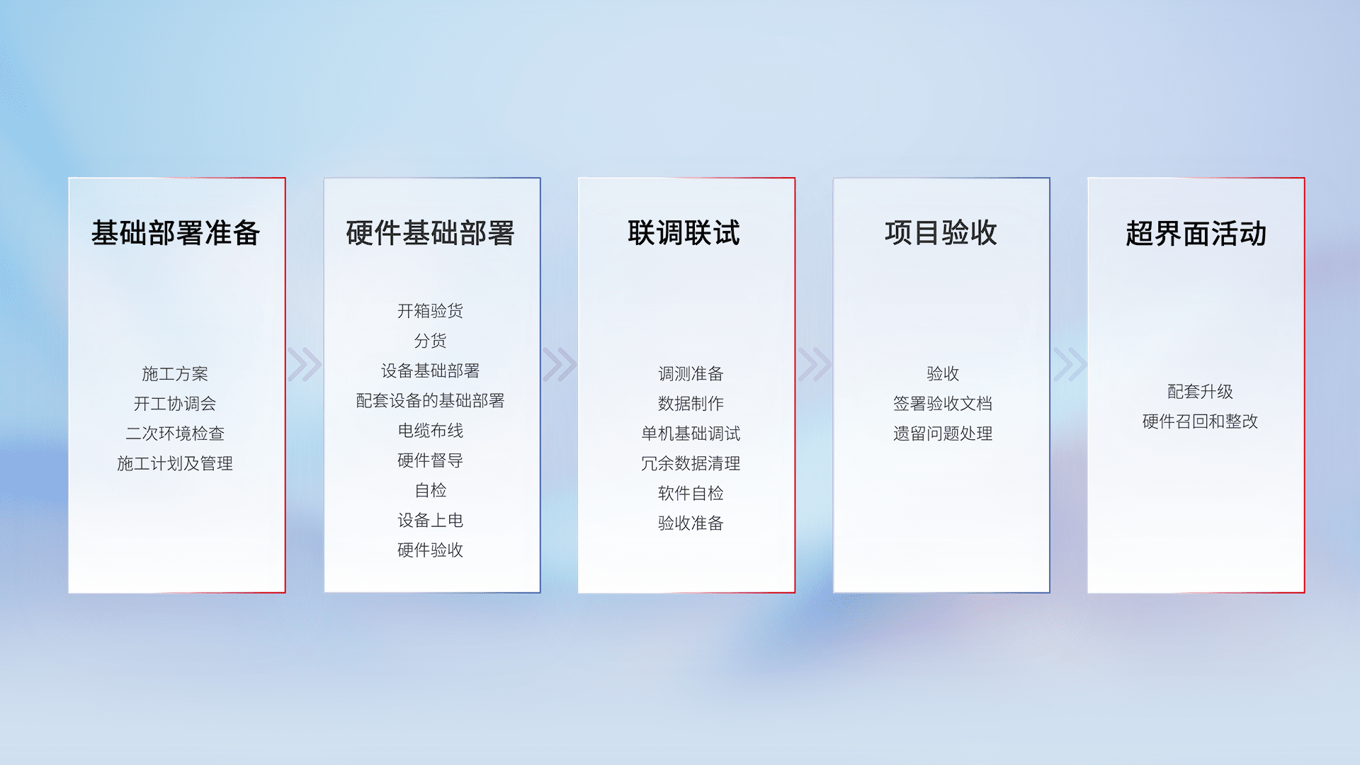 从基础部署准备、、、硬件基础部署、、、联调联试、、、项目验收、、越界面活动的全过程可追溯,,,保证施工质量和进度。。。